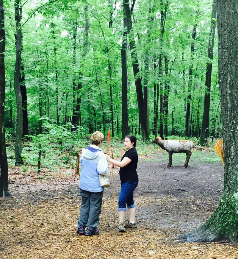 Lora Dombrosky, right, Civil Engineer with Moon Township, learns from our guide that this is not a tipi or teepee in the background, but a brushed hut, a temporary shelter.